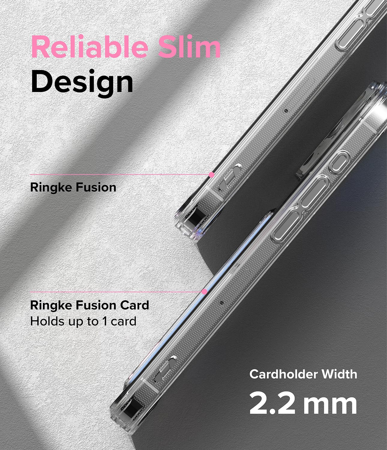 The built-in card holder adds only an extra 2.2mm height to retain the Fusion case's slim and lightweight form. The cardholder is separately integrated onto the case to prevent direct contact between any inserted cards and the back of the device. The cardholder holds up to 1 card at a time with a secure anti-loss and easy-to-remove function for comfortable and easy carry.