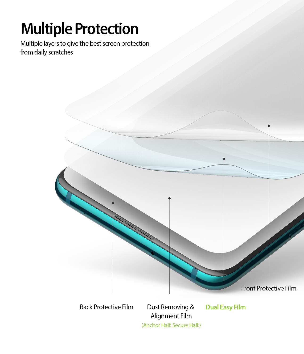 Invisible FitWhy ruin the aesthetics of your device by adding a heavy glass screen protector? Make your protection invisible and lightweight. The Dual Easy Film Full Coverage Screen Protector is an imperceptible layer of added security to keep your phone screen sparkling and scratch-free.