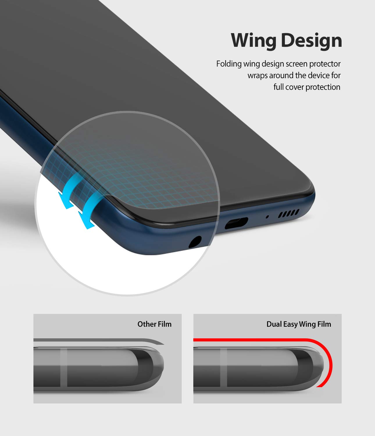 - Wing Design - Protruding side film sections wrap around your device and offer full-coverage protection with anti-lift properties.