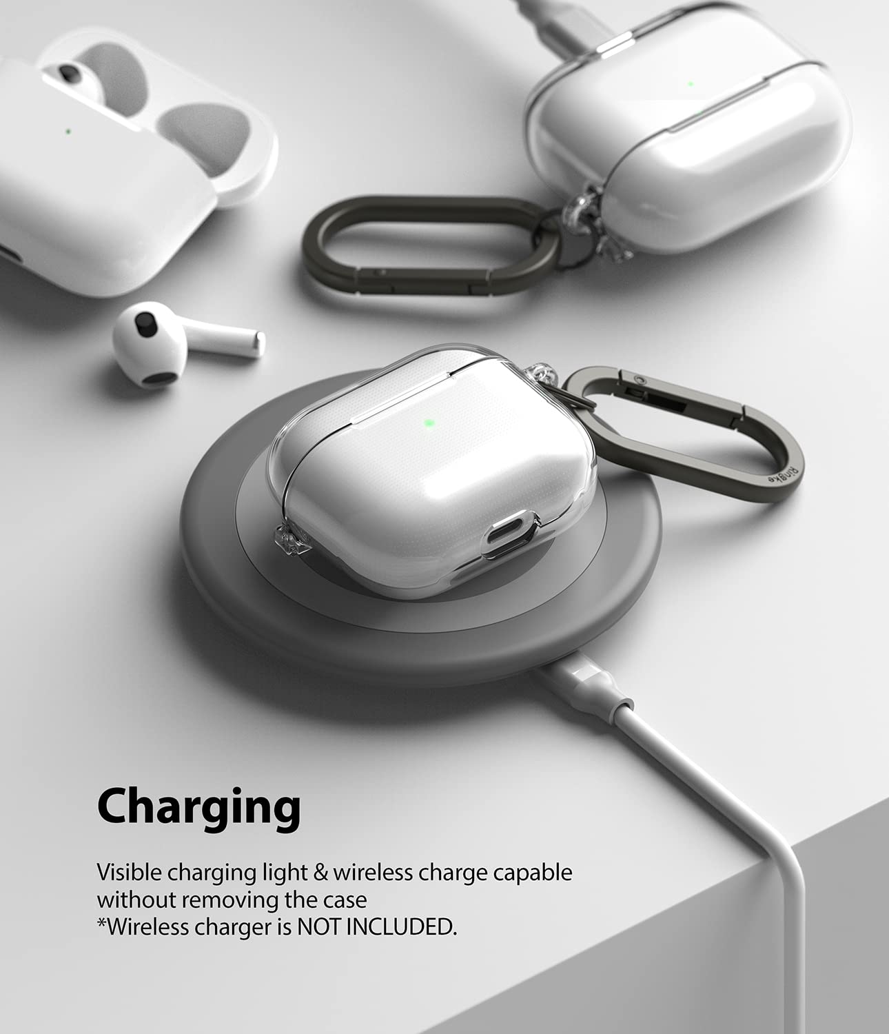 Attach the case to yourself or anywhere else for extra protection. Ringke AirPods 3 Case comes included with a split keyring and a multipurpose carabiner, so you can easily hook it onto your pants, keys, or bag for super convenient hands-free carry.
