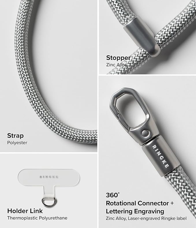 Ringke Holder Link Flow Hand Strap P-Type – Adjustable Tangle-Free Rope Wrist Loop with TPU Tether Tab – Silky Silver
