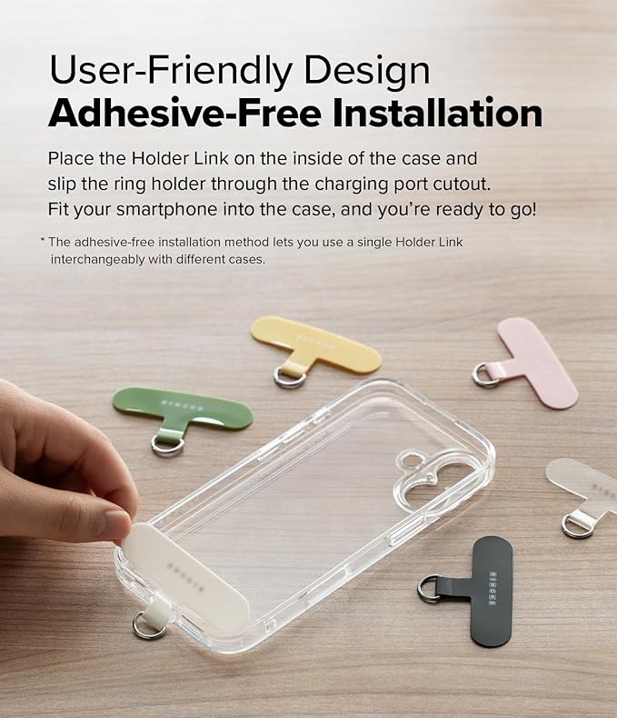 It easily slips into the back of your smartphone case without warping the fit, and the non-adhesive installation means the Holder Link can be reused again and again.