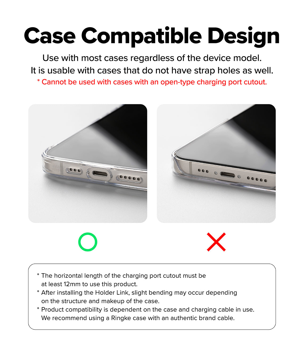 To install, you just need a case! Slip the Holder Link into the case, fitting the metal ring through the charging port cutout on the bottom, then replace your phone into your case, and you're done!