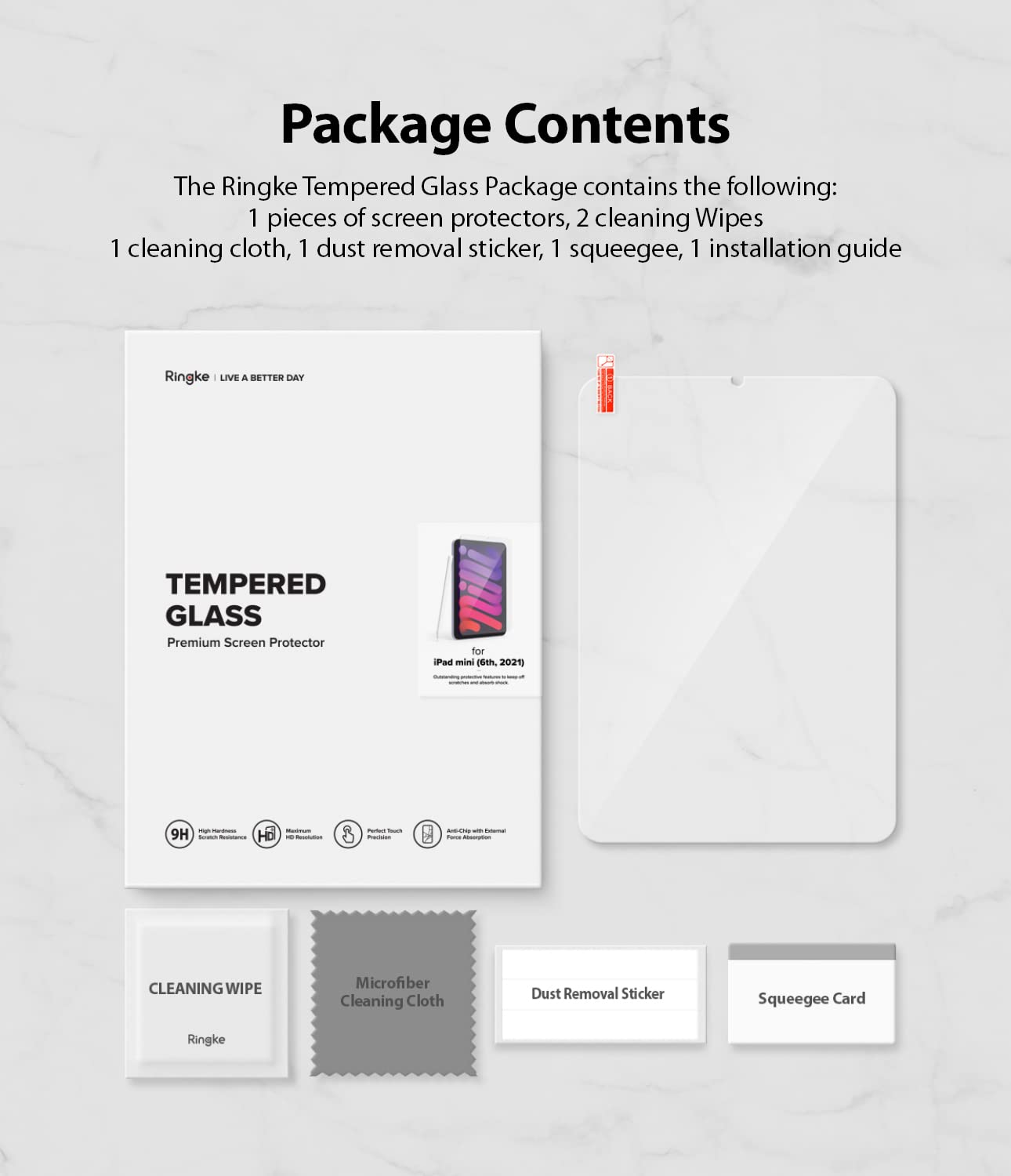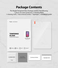 Includes: 1 Tempered Glass Screen Protectors, 1 Squeegee Card, 1 Fiber Cloth, Dust Removal Sticker, and Installation Instructions.