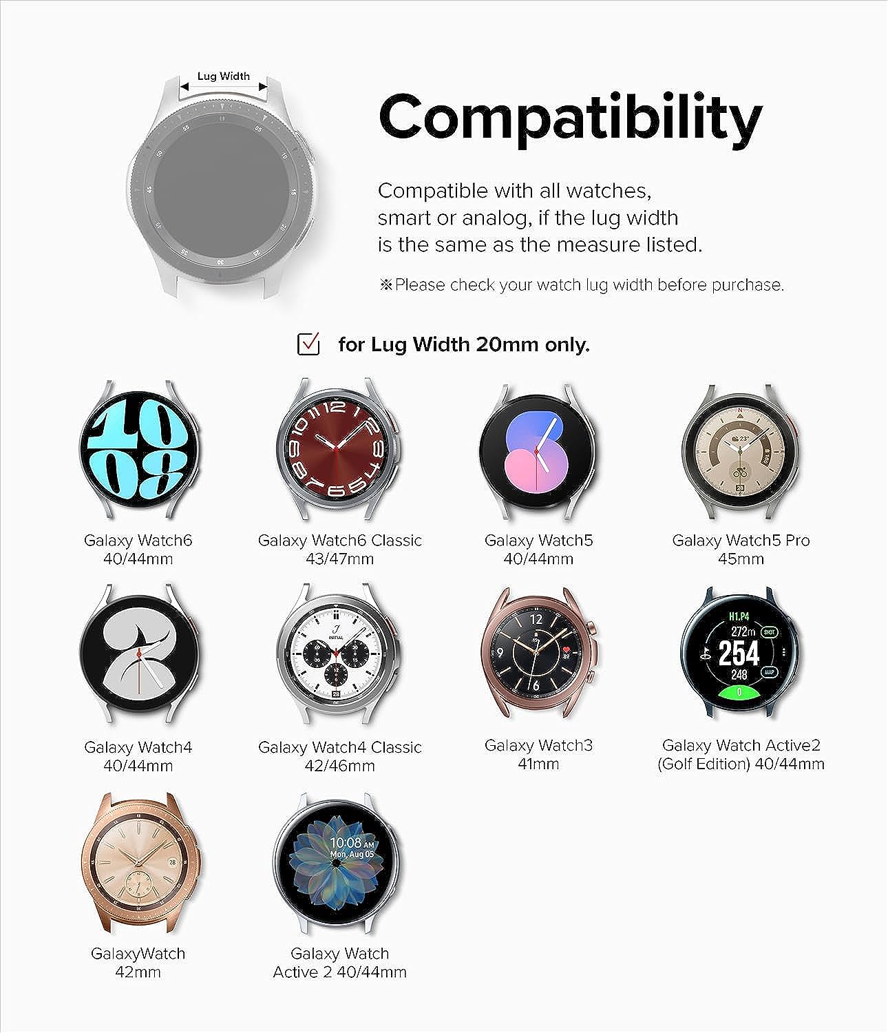 - Compatible with the Samsung Galaxy Watch 6 40mm/44mm, Galaxy Watch 6 Classic 43mm/47mm, Galaxy Watch 5 Pro 45mm, Galaxy Watch 5 40mm/44mm, Galaxy Watch 4 40mm/44mm, Galaxy Watch 4 Classic 42mm/46mm with Watch Lug 20mm