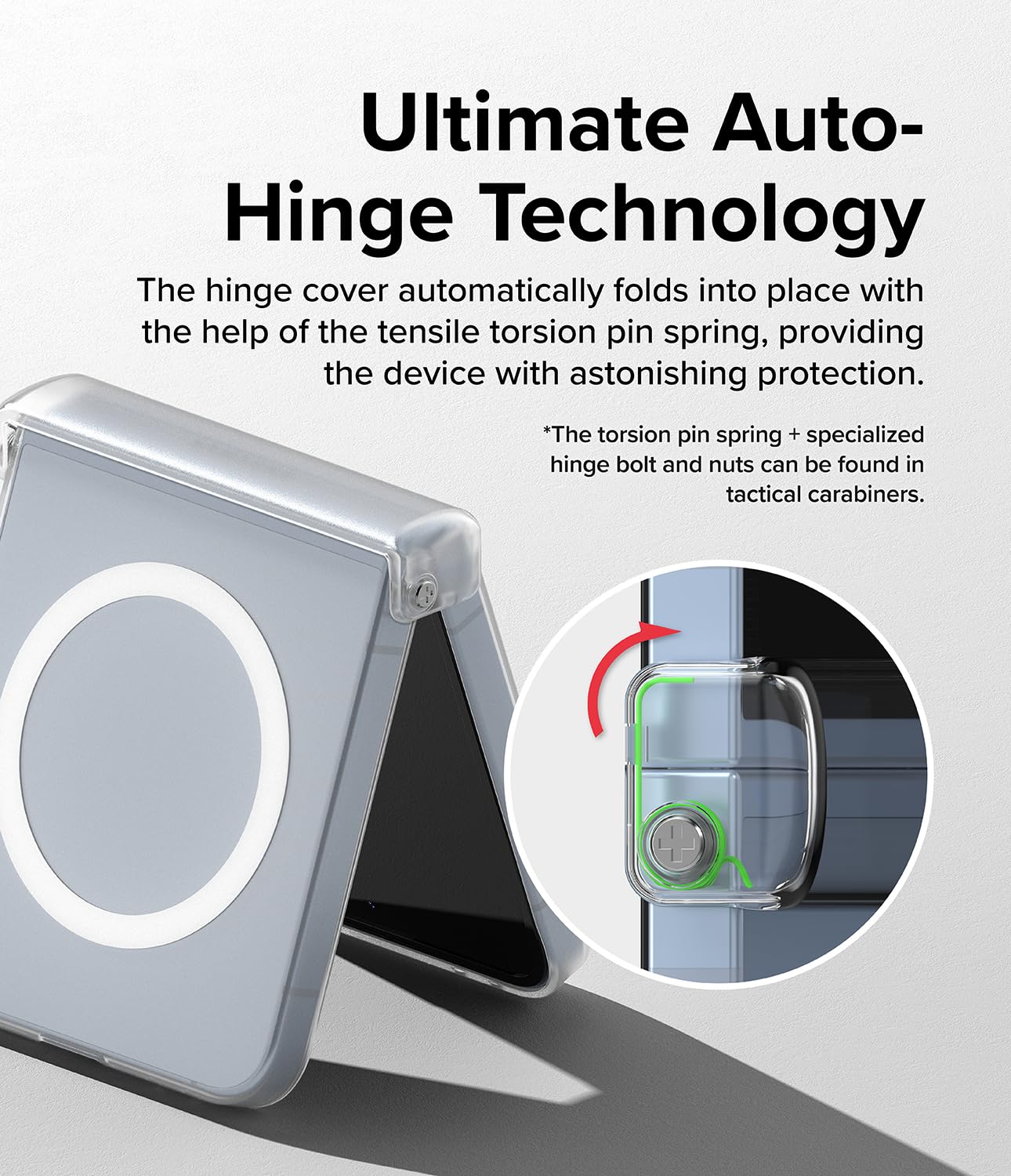 - Automated Hinge Protection via the torsion pin spring technology that smoothly covers the hinge when the device is folded.