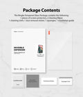 Includes: 1 Tempered Glass Screen Protectors, 1 Squeegee Card, 1 Fiber Cloth, Dust Removal Sticker, and Installation Instructions.